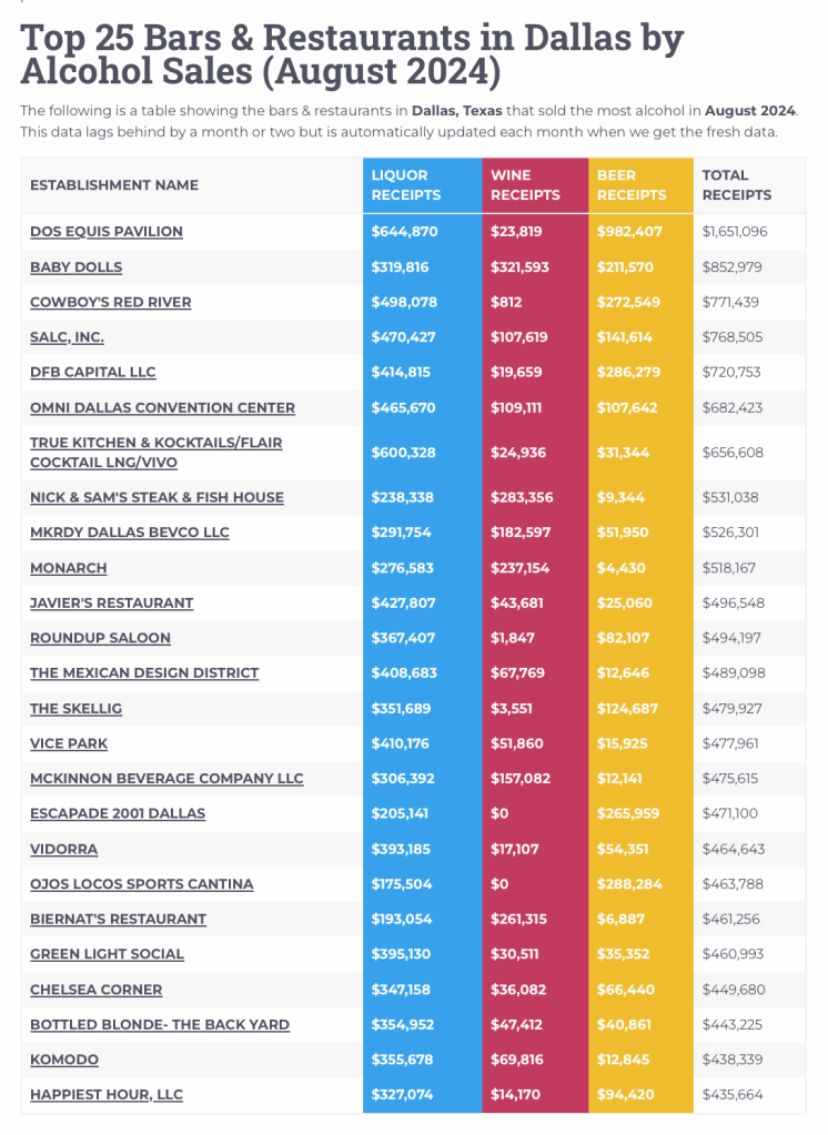 Every month-ish, a report on the top 25 performing bars and restaurants in Dallas is released on www.alcoholsales.com. Alcohol sales are one of the most significant indicators of a bar or restaurant’s profitability, accounting for the most profit margin across sales breakdowns. Data on alcohol sales ultimately shows us who is who in Dallas hospitality, regardless of their press, luxury buildouts, prime location, or brilliance of concept.