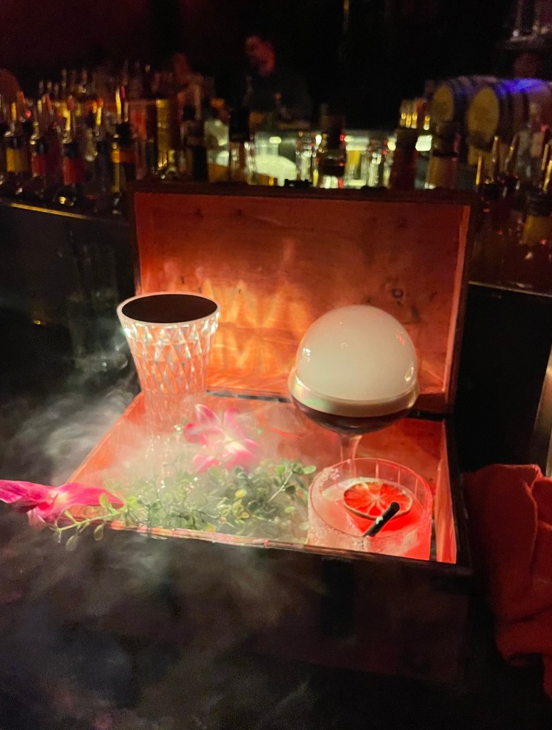 Those creative risks were on full display during my Tuesday night visit. Unbeknownst to us, my companion and I’s espresso martini and margarita arrived in what can only be described as a treasure chest, complete with fake greenery, real orchid blooms, a color-changing light, and, for good measure, some fog. Was any of it necessary? Absolutely not. But it was undeniably fun.