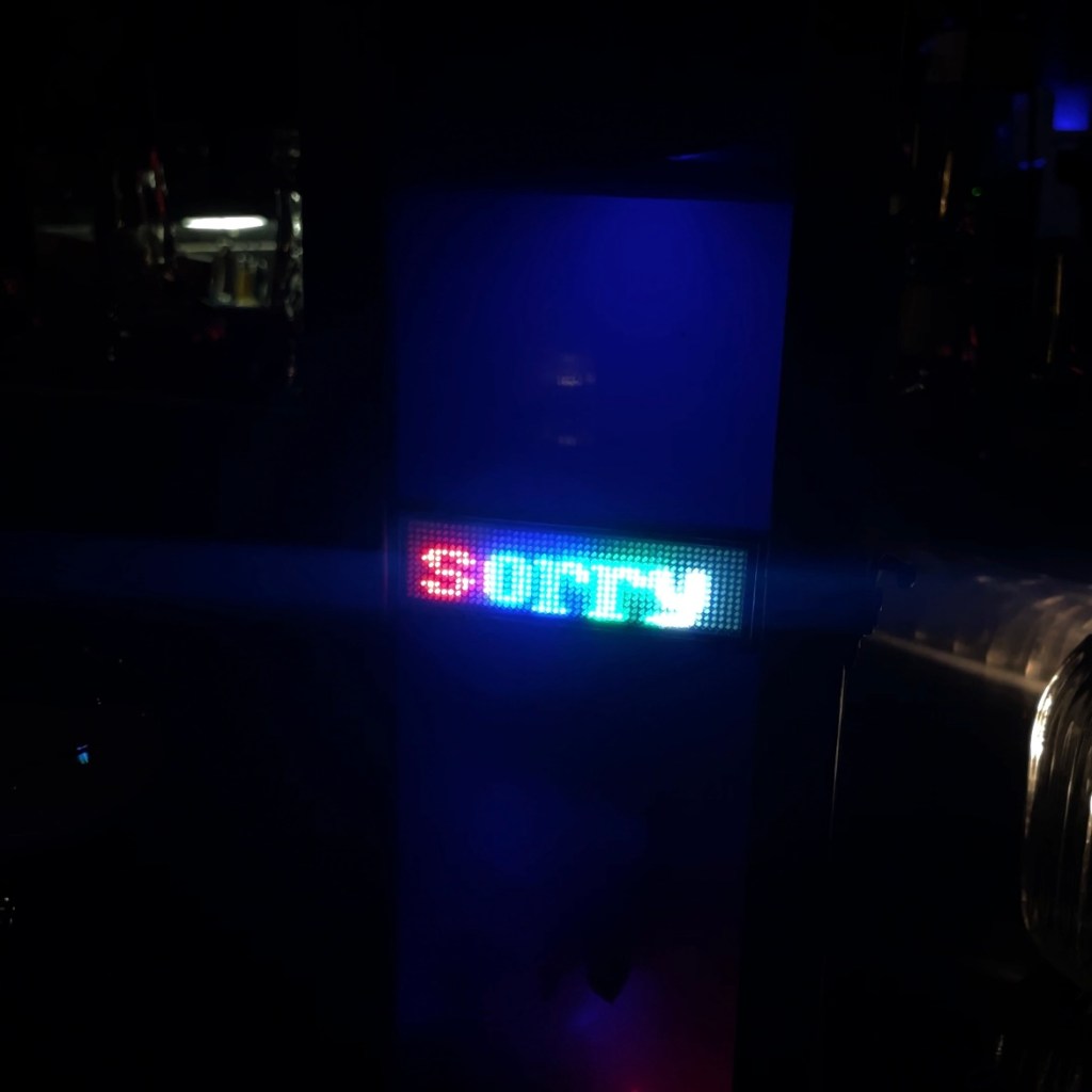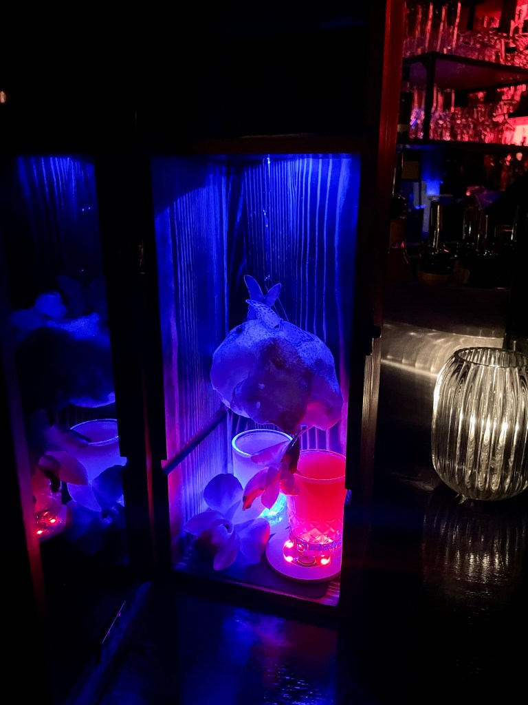 Then came the fog bubble. It topped my companion’s espresso martini and, after a premature pop, our server swooped in with a device called a Flavour Blaster to recreate the bubble—only to tip the box into our laps in the process. No worries, though—a couple of microfiber towels later, we were fine. And just when we thought the moment was over, we were presented with a lit-up tower featuring a scrolling LED message that read: “sorry for throwing martini at you.” Well put.