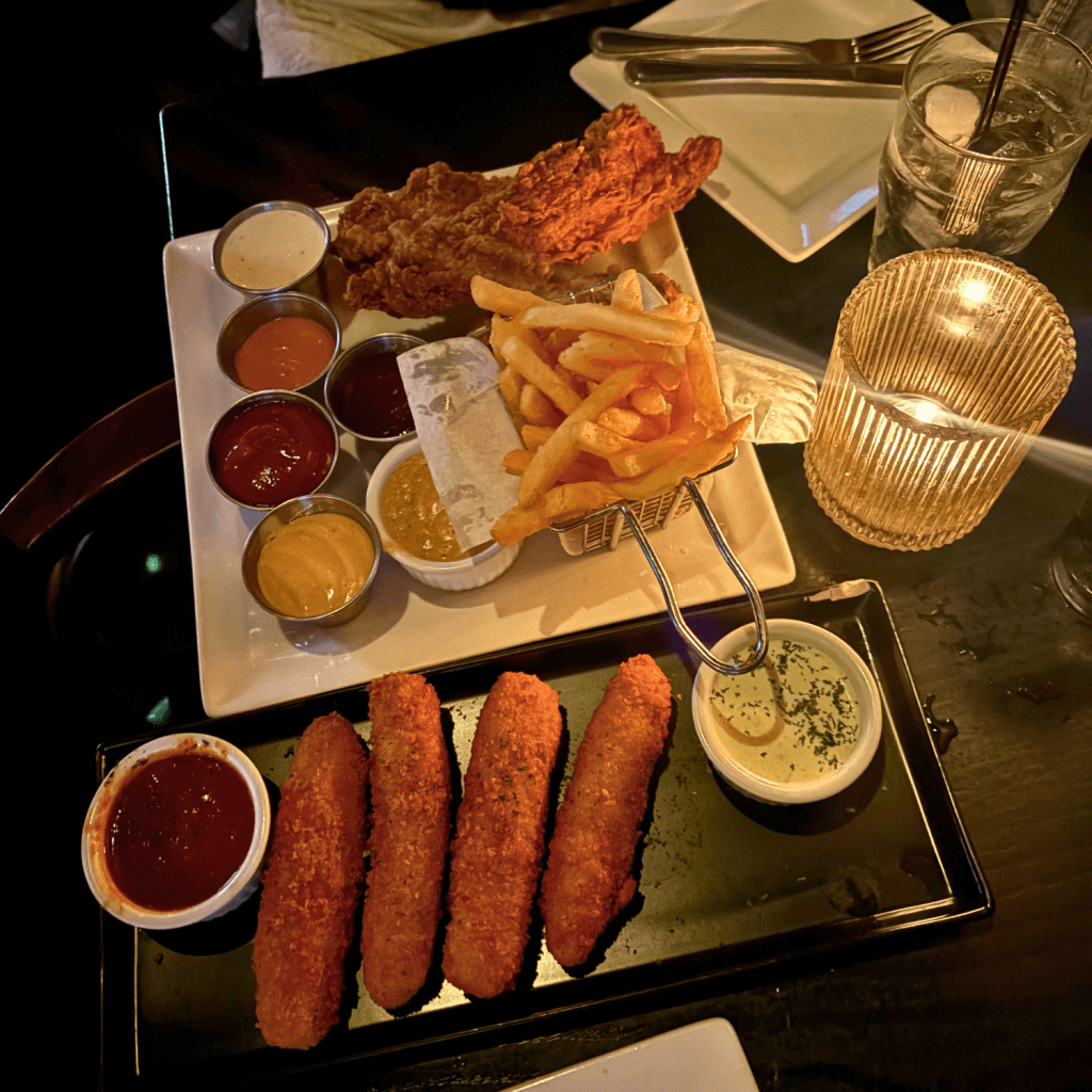 Shoutout again to The Standard Pour: hot food, often fried, and more dipping sauces than anyone needs (three kinds of tomato sauce alone). The perfect spot for dining while blacked.