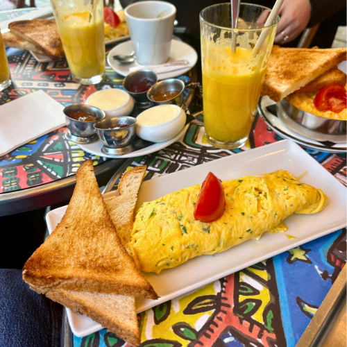 The French do breakfast right. The first photo is from a €24 breakfast I ordered that somehow included orange juice, hot chocolate, an egg-and-herb omelette, toast with butter and jam, and a croissant—an astounding number of items and vessels balanced on the smallest table you can imagine.