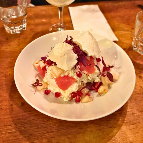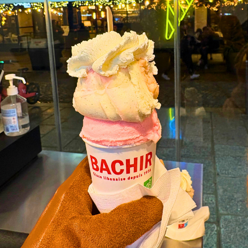 Pavlova with ripe red fruit is excellent. Turkish ice cream—especially when given the option to coat it in pistachios—is also excellent, and I’m even more fond of Bachir because the ice cream scooper hit on me.